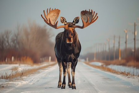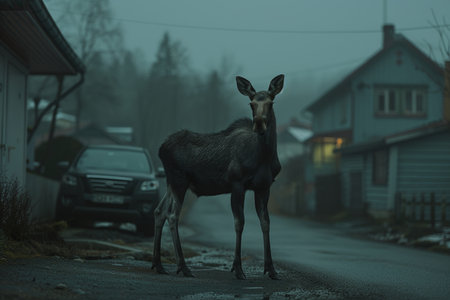 A moose stands in the middle of an asphalt road and stops the car. The scene captures a moment of wildlife interaction in an urban setting with an empty road