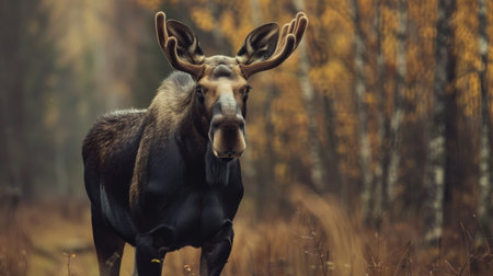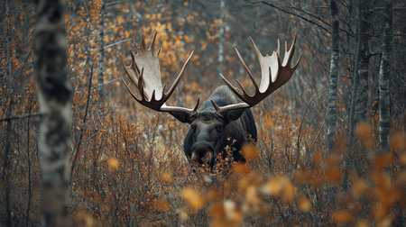 A majestic moose stands proudly in a serene forest, showcasing its impressive antlers amidst vibrant autumn foliage. This captivating wildlife portrait captures the essence of nature's beauty.