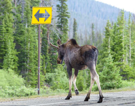 Young Bull moose with small antlers walking in the forest of Glacier National Park, Montana, USA. Majestic Alces alces in its natural habitat. Wildlife of American Rockies.