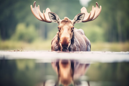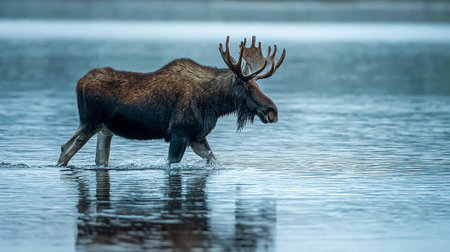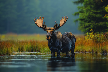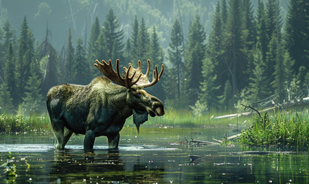 A majestic moose standing in a misty lake, its impressive antlers and large frame reflecting in the calm water of the early morning.