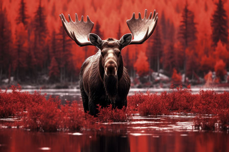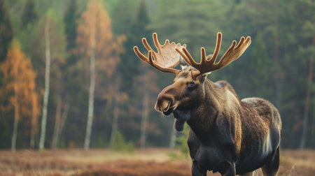 Majestic bull moose in autumn wetland, forest background; wildlife nature photography