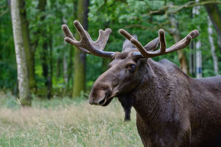 Moose in the forest. Wildlife scene from nature. Beautiful animal portrait.