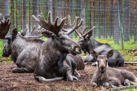 Wild Moose family with huge antlers Grazing near Kiruna, Sweden.