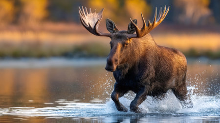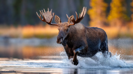 Large bull moose running through shallow water with autumn colors reflecting at sunset