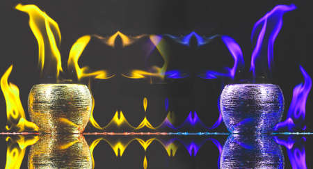 Water mixed with lighter fluid inside a golden pot throwing ice stone to cause thermal shock and cause a splash of liquid with fire on the black background.