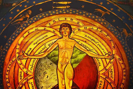 Portrait of a medieval scientist working in his laboratory. Alchemist. Halloween.