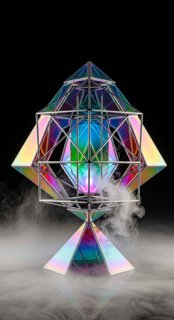 A closeup of a transparent pyramid on the Yin and yang symbol on the table with rocks on it