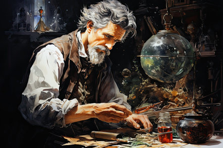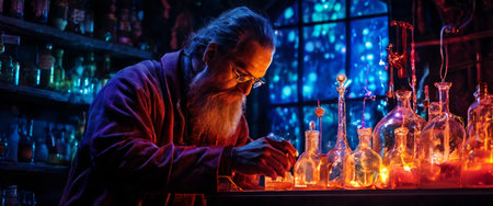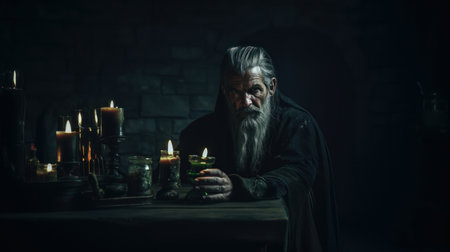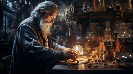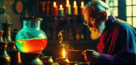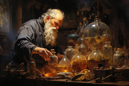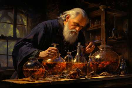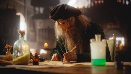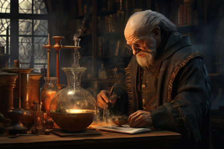 Fantasy Setting: Portrait of an Alchemist Working on Elixirs in his Medieval Laboratory, Taking Notes. An Old Sorcerer Creating a Healing Potion for his Village, Experimenting