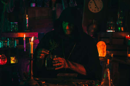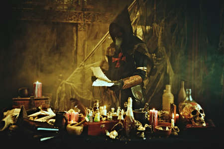 Evil wizard or alchemist making the witchcraft in a dark and scary dungeon. Halloween image.