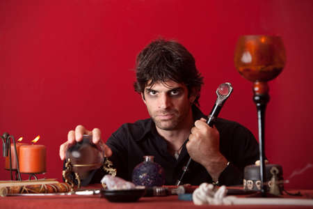 Portrait of a crazy medieval scientist working in his laboratory. Alchemist. Halloween.