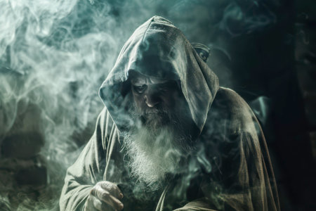 A bearded figure dressed in a hooded cloak peers intently as tendrils of smoke swirl around him in a shadowy environment. The atmosphere is thick with mystery, suggesting a moment of contemplation or incantation.