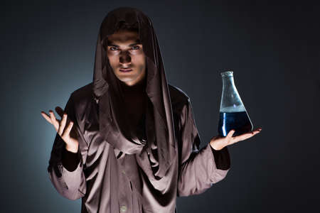 medieval alchemist in mantle holding flask with magic potion isolated on black