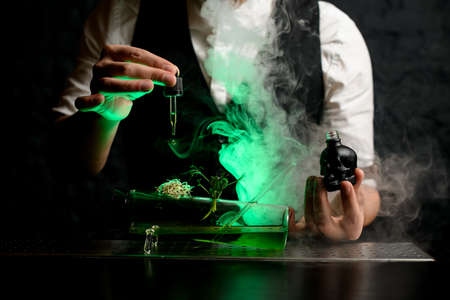 close-up. Bartender's hand holding dropper over special designer glass flask with green liquid inside and decorated with plants at smoky bar