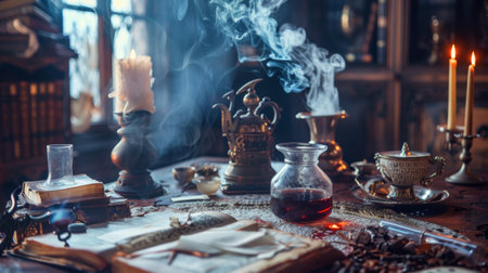 A vintage study table adorned with books, lit candles, and decorative elements, emitting a mysterious and nostalgic ambiance with a touch of intrigue.