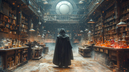 A scientist in a top position focuses intently on brewing potions in a vintage laboratory filled with glassware.