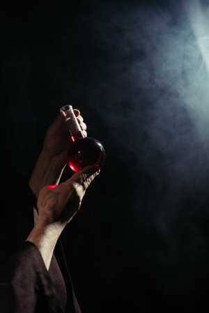 mysterious alchemist adding ingredient into pot while cooking in dark on black background with smoke