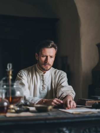 Male historical alchemist engaging in deep contemplation and research, meticulously studying ancient texts and performing experiments with various liquids in an old laboratory