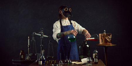 Mysterious man in plague doctor mask sits amidst vintage lab equipment, and noting with feather in vintage laboratory against dark mystery background. Concept of medicine, science, pharmaceutical.