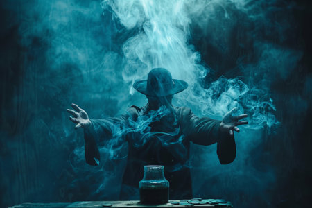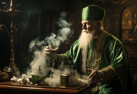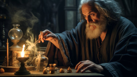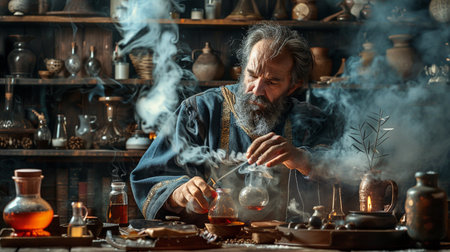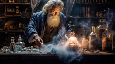 A medieval magician and sorcerer prepares a smoky potion in his laboratory. AI generated.