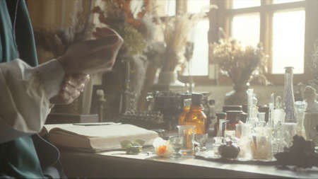 A close-up of a perfumer at his desk looking for a new fragrance. Vintage cinematic concept. Sunny day in the workshop. Lots of ingredients, glass flasks on the table. Concept of perfumery