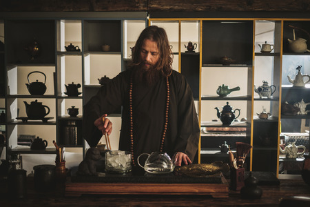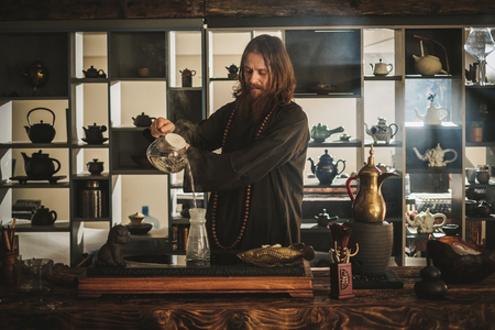 Old man with long white beard and mustache in orange robe making magic potion in the old laboratory.