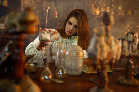 Portrait of a medieval scientist working in his laboratory. Alchemist. Halloween.