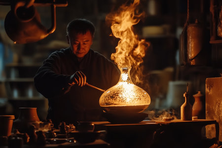 In a traditional workshop setting, an artisan skillfully shapes soft clay with flame, showcasing their artistry. Generative AI