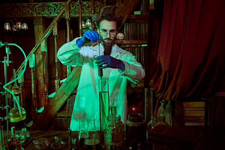 Crazy scientist works in his laboratory, lit by a mysterious green light. Character of a science fiction novel.