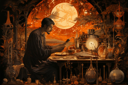 A man in a black robe sits at a table with a bunch of bottles and a candle, AI