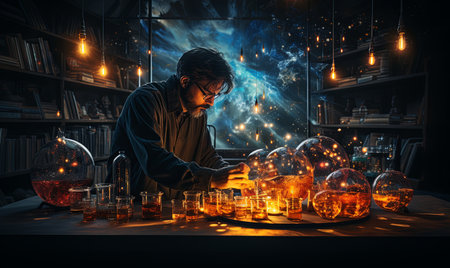 Scientist in vintage laboratory surrounded by glowing glass apparatus
