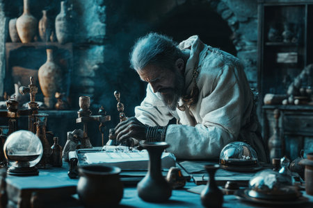An elderly scholar carefully writes notes at a wooden table surrounded by glass vials and ancient artifacts.