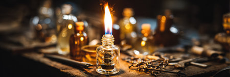 A warm flame shines from a glass container atop a weathered wooden table, surrounded by metal tools and oil-filled bottles in a workshop setting.