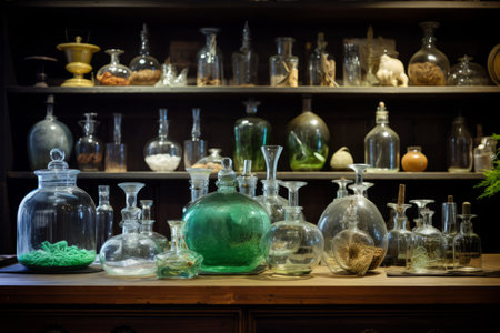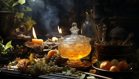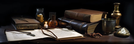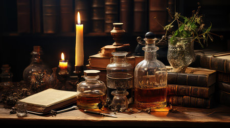 Mystical still life of an alchemist's table laden with ancient bottles, herbs, and esoteric symbols