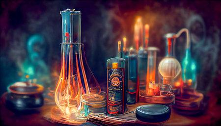 Wizard laboratory, chemical tubes and flasks of different shape and color, ai illustration