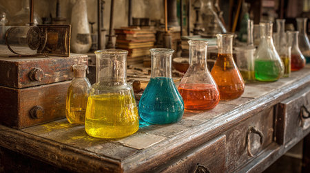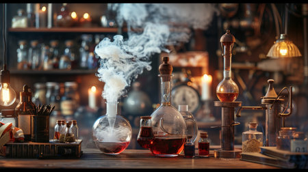 A vintage laboratory setting with various glassware and scientific equipment, creating a nostalgic and detailed scene.
