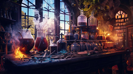 A wooden table is covered with various glass bottles filled with colorful liquids. A large pot simmers with bubbling contents. Dried herbs and plants surround the pot, creating a magical atmosphere.