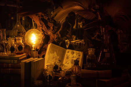 Halloween decoration, wooden desk with vials, flasks and bottles with potions, witch's secret room with magic artifacts and candles on the table, alchemist's workplace, AI generated