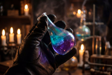 A gloved hand holds a glass flask filled with swirling luminous blue and purple liquid in a dark laboratory setting illuminated by warm candlelight and blurred scientific glassware in the background.