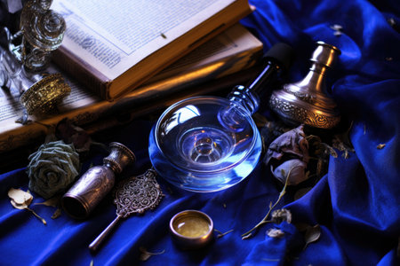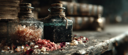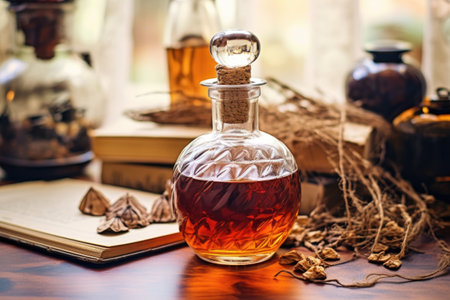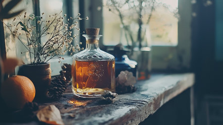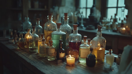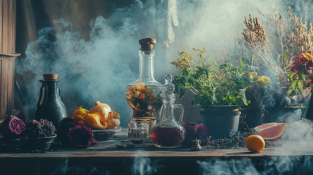 Mystical still life of an alchemist's table laden with ancient bottles, herbs, and esoteric symbols