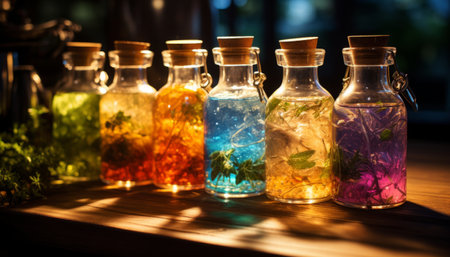 A row of glass bottles filled with different colored liquids. Generative AI image.