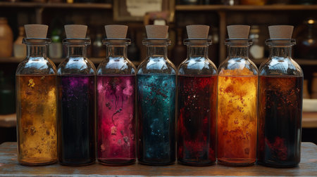 Discover a stunning array of colorful potions in glass bottles, each brimming with unique liquid textures and vibrant hues, set against a rustic backdrop.