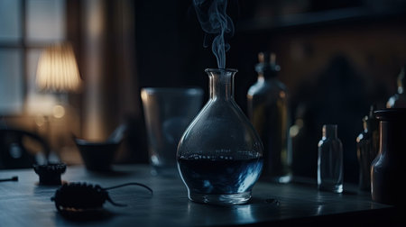 Vintage glass laboratory flask with blue liquid on the table in the dark, Generative AI