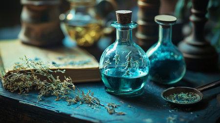 Artistic vintage setup of glass bottles with dried herbs placed on a rustic wooden table, creating an old-world charm.