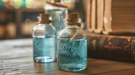 A set of vintage glass bottles filled with blue liquid, displayed on a rustic wooden table with soft lighting.
