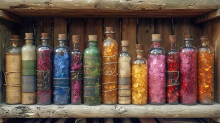 Rows of antique glass bottles filled with colorful liquids and dried herbs on wooden shelves in a dimly lit, old fashioned apothecary shop, evoking a sense of history and mystery.