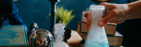 Halloween decoration, wooden desk with vials, flasks and bottles with potions, witch's secret room with magic artifacts and candles on the table, alchemist's workplace, AI generated