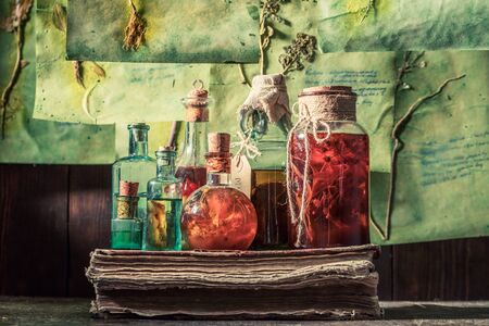 Magic potions in bottles near old rustic window with backlight. Halloween witchcraft concept