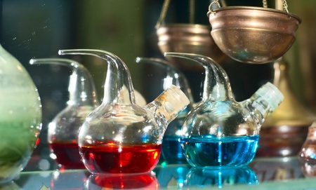 Small bottles with colorful liquids lie on the table among various magical attributes.