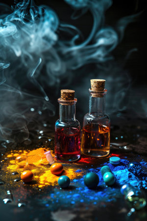 A vividly colorful potion bottle is set against a mystical atmosphere filled with swirling smoke and intrigue