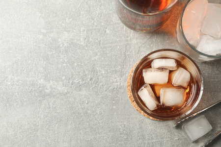 Bottle, glasses with ice cubes and whiskey on grey background, top view